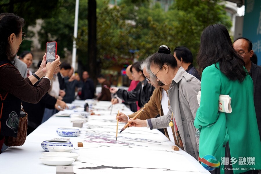 在百米书画长卷创作现场,来自省、市的50名书画名家以画为媒,围绕弘扬中华优秀传统文化为主题,在铺展开的洁白长卷两侧挥毫泼墨,即兴创作。创作者们或凝神静思,画笔在黑白灰间切换自如,或通过遒劲的笔法在纸上留下艺术大字。长卷之上,国画的水墨韵味与书法的线条之美交相辉映,共同绘制成一幅深情展现“我爱湘乡”的壮丽图景。现场气氛热烈,墨香四溢,引来众多市民围观,大家纷纷为这场视觉与文化的盛宴点赞。
