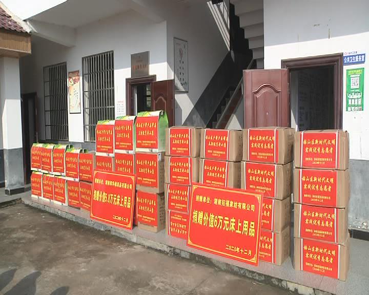 在欧江岔镇东团村村委,湖南银华棉织品有限公司、湖南拓福家纺有限公司两家爱心企业向东团村及赫山区优秀志愿者,现场捐赠了总价值11.8万元的床上用品。